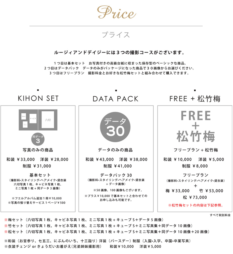 ルージィアンドデイジーは、新しい七五三写真のかたちを1998年5月5日に京都、藤井大丸にて世の中に発信しはじめました。